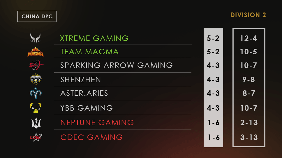 China’s Division II familiar names on top, with Xtreme Gaming – a strong stack with names like Zhang “Paparazi灬” Chengjun and Ding “Dy” Cong securing the first spot. Team Magma follows in 2nd place and will both be promoted to the upper-division. Another known org, however, places bottom. CDEC Gaming is out of the DPC. With Neptune Gaming, CDEC will exit Division II.