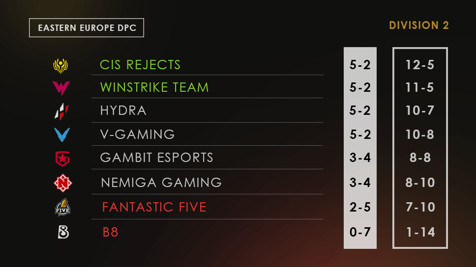 The EEU Division II isn’t any surprise as the star-studded lineup of CIS Rejects takes the top spot. But their triumph wasn’t uncontested. EEU Division 2 had a four-way tiebreaker to decide the top 4 placings, between CIS Rejects, Winstrike Team, HYDRA, and V-Gaming. The winners of the tiebreakers were CIS Rejects and Winstrike Team – both will be in the next season’s Division I. B8, however, had a poor performance throughout the season, finishing at last place with 0 wins. Together with Fantastic Five, B8 will exit the DPC.