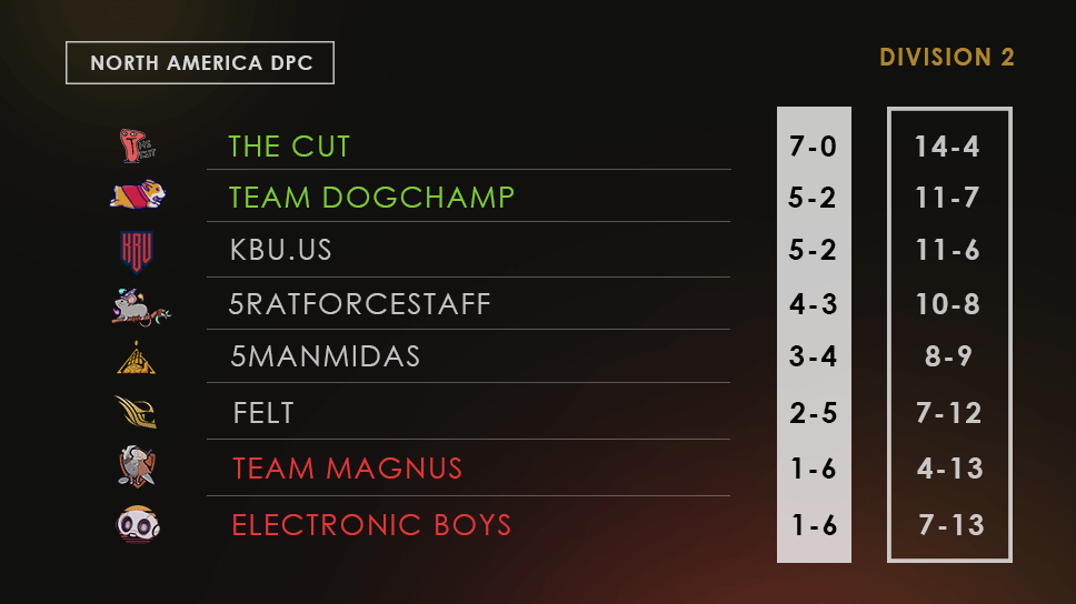 Meanwhile, in Division II, The Cut stays on top with an undefeated streak, while Team DogChamp follows at 2nd place. Team Magnus and Electronic Boys are eliminated from the DPC.