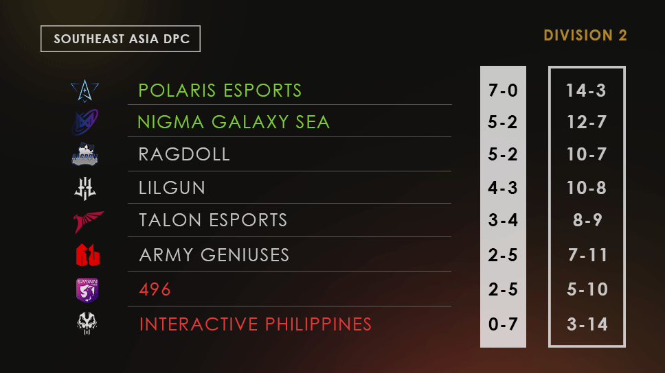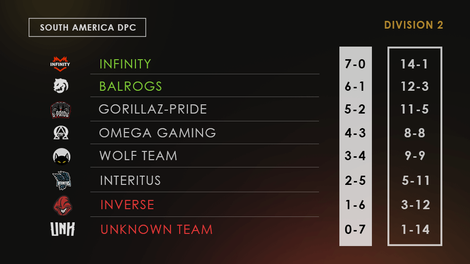 From Division II, Infinity swept the league with a 7-0 win streak. Together with Balrogs, the 2nd placer, they will be promoted to Division I. While Unknown Team and Inverse are out of the DPC.