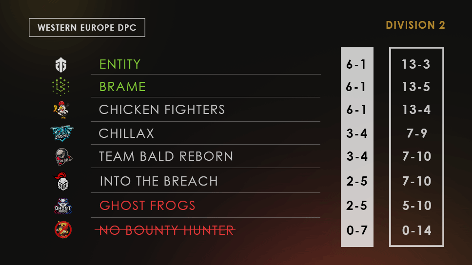 From Division II, we saw a close score among the top-three finishers, Entity, Brame, and Chicken Fighters. But the tiebreakers weren’t in favor of Chicken Fighters. Next season, WEU Division I will welcome the return of Brame, who was relegated the previous season, and Entity. Ghost Frogs is now eliminated after a tiebreaker series against Into The Breach. No Bounty Hunter was removed from the DPC after forfeiting two series.
