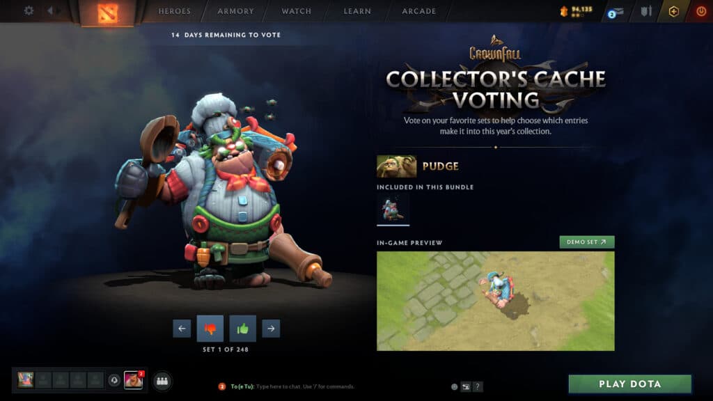 There are a total of 248 hero sets to vote for in the Dota 2 client. The top and most popular heroes will be featured in the Crownfall Collector's Cache which you can purchase once released. Valve also highlighted that some of the people's favorites will be released "as part of a future Crownfall update."