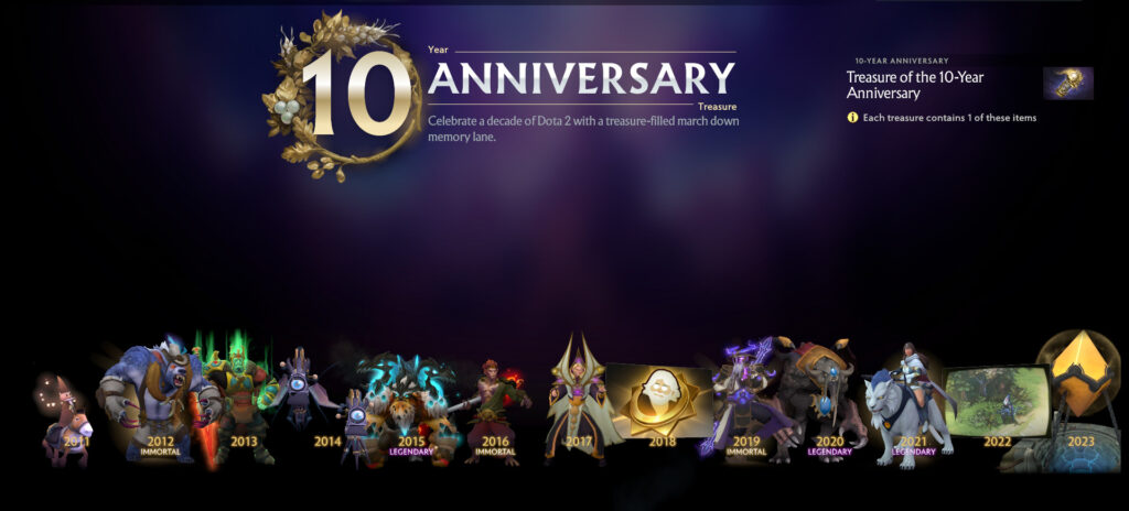 Valve finally dropped the Dota 2 10-Year Anniversary Treasure featuring thirteen nostalgic cosmetics. Each Treasure is a retouched piece from each year that Dota has existed from 2011 to 2023.