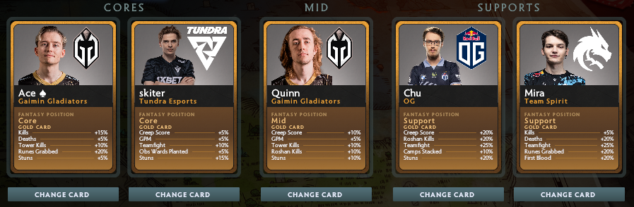 In our picks for day one, we made sure to only pick players on teams what had two games. That eliminates Talon and 9 Pandas from being effective picks for the day. Our dyrachyo’s GPM bonus, and Team Fight win bonus +10% stat make him a great pick as core, while skiter’s Creep Score bonus is perfect. Quinn is an obvious choice for mid laner, and Aster’s 皮球 and GG’s Seleri round out the support due to us owning the Gold Cards, and their good bonus stats (Deaths on Supports is a very good stat). Remember that stat bonuses on cards are different each time, and it’s why new packs are always valuable!