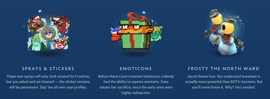 To get Frostivus Treasure Chests, and the new Treasure set, you’ll just need to play Dota 2 (horrible, we know.) Each match you play you’ll fill up your Frostivus Spirit Meter, and once it fills up, you’ll receive a chest. You’ll also receive 2000 bonus points towards your meter for your first win each day. As usual, you’ll receive half points for a Turbo game victory.