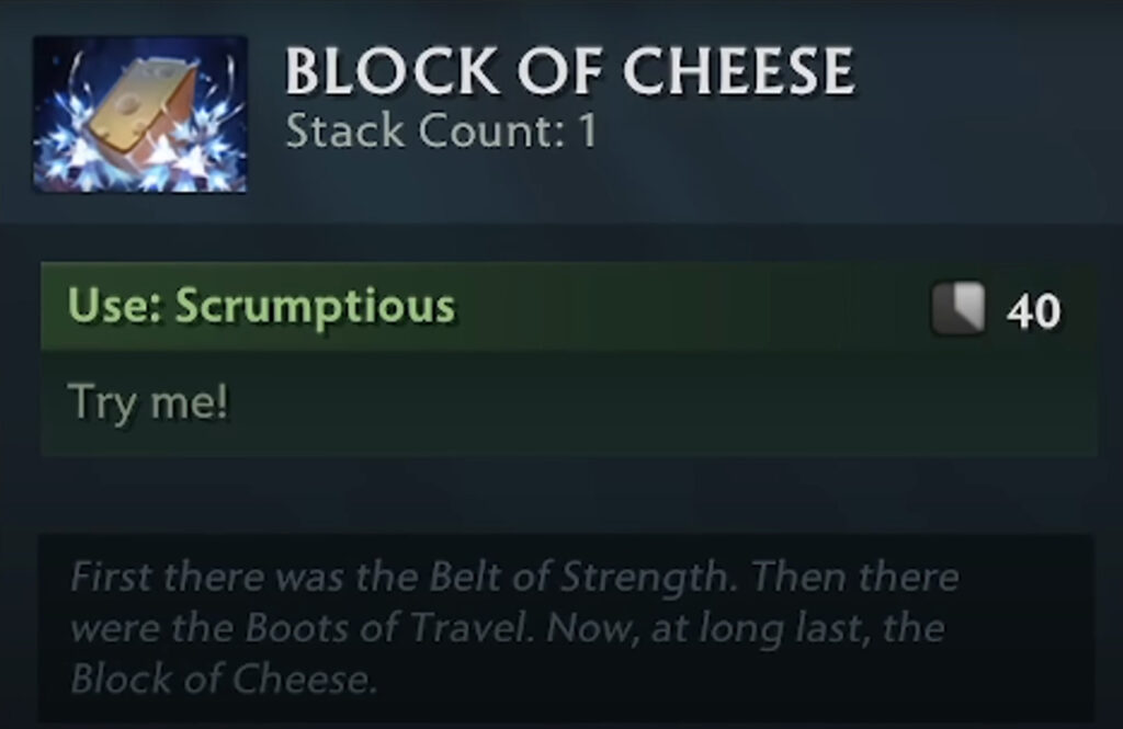 A Block of Cheese is a consumable item in Dota 2. By using its active, Scrumptious, you consume the Block of Cheese to grant yourself a 500 damage barrier or shield.