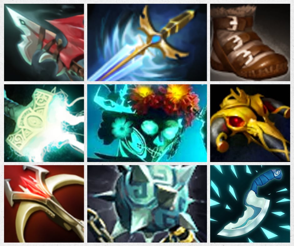 Item builds differ according to roles and situations. Generally, the most popular items for Muerta are Hurricane Pike, Black King Bar, and Maelstrom built into either Gleipnir or Mjollnir.