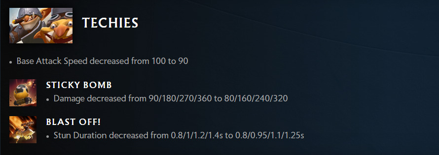 Techies also faced the brunt of the patch. This pesky hero has been dominating the support role since Patch 7.33 dropped. But Valve has now nerfed Techies’ Base Attack Speed, damage of the Sticky Bomb, as well as, Blast Off!’s stun duration.
