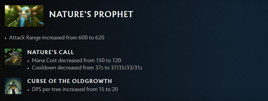 Another hero who vanished from this Tour is Nature’s Prophet. But this patch brought a handful of buffs to his abilities which might see his return. His attack range is increased by 20. Nature’s Call now has a lower mana cost and cooldown. Other than that, the Curse of the Oldgrowth now has a bigger DPS per tree.
