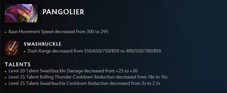 Pangolier is one of the nightmares of the Universal attribute. In Patch 7.33d, Dota 2 reduced his base movement speed by only 5. But his Swashbuckle dash range has been taken down significantly for the first two levels, scaling from 550/650 to 400/550.