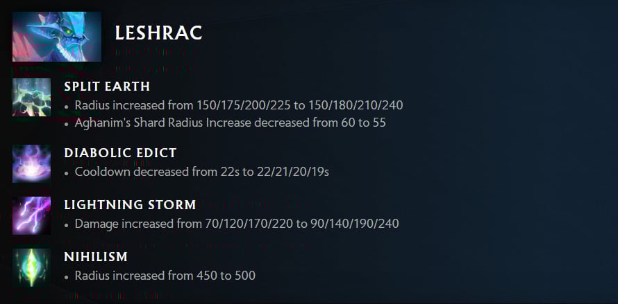 Valve is bringing Leshrac back! Patch 7.33d increased Split Earth’s radius, decreased Diabolic Edict’s cooldown, increased Lightning Storm’s damage and Nihilism’s radius.