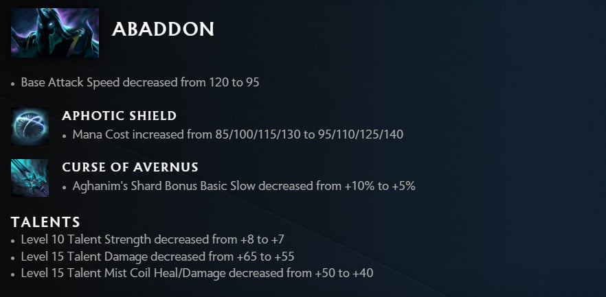 Abaddon received a handful of nerfs to his abilities despite not really having a strong showing. His Base Attack Speed suffers a massive nerf from 120 to 95. His Aphotic Shield’s mana cost is increased and the Aghanim’s Shard bonus slow for Curse of Avernus is also notched down by 5%.