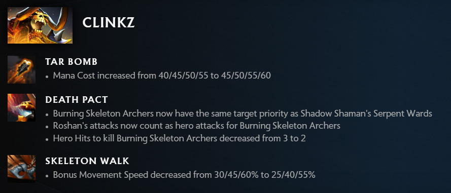 Clinkz has been a powerful force in Dota 2, from a dead hero to an overpowered skeleton. But in Patch 7.33d, he received a number of nerfs. This includes mana cost increment for Tar Bomb, and a slower movement speed bonus from Skeleton Walk. Death Pact’s Skeleton Archers are also now a little weaker with these changes: