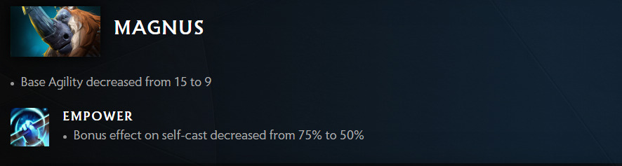 Although only a few, the changes to Magnus are pretty significant. His Base Agility is taken down from 15 to 9. The Empower spell is also less effective for Magnus as its self-cast bonus decreases from 75% to 50%. Ouch.