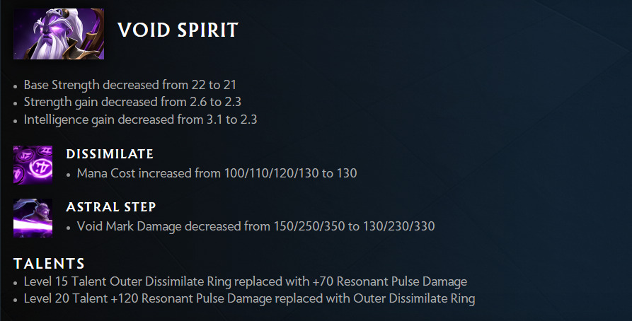 One of the biggest nerfs hit a Universal nuisance, Void Spirit. Its Base Strength, Strength gain, and Intelligence gain are all decreased. The Mana Cost for Dissimilate is increased and Astral Step’s damage is notched down. Its Level 15 Outer Dissimilate Ring talent has been swapped with the Level 20 Resonant Pulse damage.