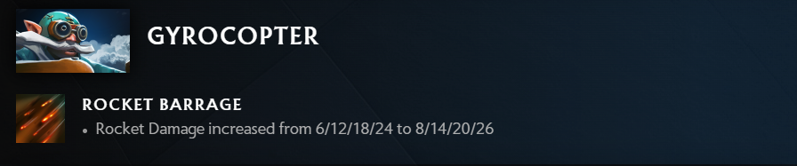 Now there weren’t too many big or significant buffs in patch 7.34e. The patch was mainly focused around nerfing the TI dominant heroes. However, some heroes made it out with a little more pip in their step. The first of which is Gryocopter with a damage increase to Rocket Barrage. The damage was increased by 2 on each level, which results in rocket barrage doing a total of 560 damage.