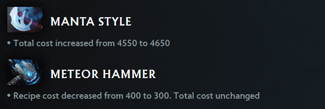 Next up the blades Kaya and Yasha. Which both didn't get changes like Sange. However, they were still subject to the same recipe price increase. Thus, this affects every Carry's favorite item: Manta Style as well as the long forgotten Meteor Hammer. While Manta Style's total price increased to 4650, Meteor Hammer's price remained the same as the recipe cost decreased.