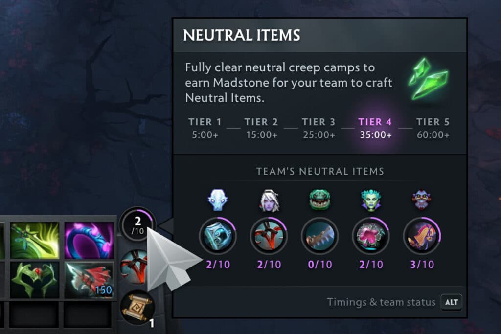 There are tiers of Artifacts and Enchantments - the same as neutral items previously. During each of the time slots, you have to clear out neutral creep camps. Clearing Neutral creep camps gives you two Madstones and one Madstone for a random ally.