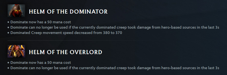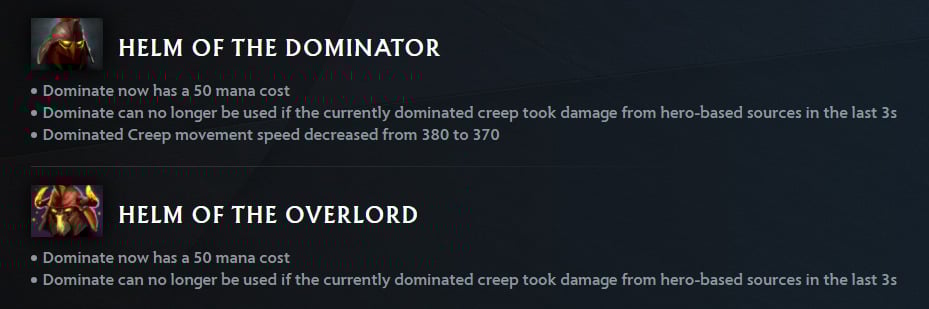 HotD, and its upgrade, Helm of the Overlord, both now feature a mana cost. On top of this, the ability to dominate a creep incurs a small cooldown if the currently dominated creep is damaged by a hero.