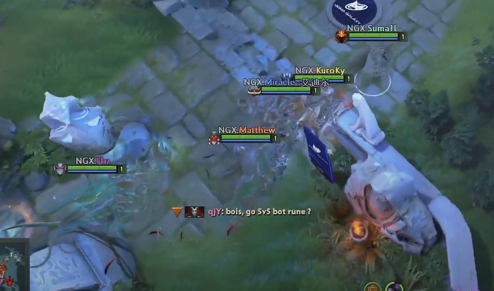 The start of game two saw COPPYBEBRA’s midlaner typing: “[Boys] go 5v5 bot rune?” The team continued to consistently spam the all chat, telling Nigma Galaxy to “stop deny” or to “relax”.