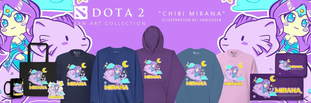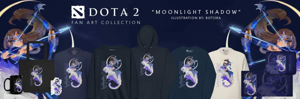 Always a treat, this year’s Fan Art collections feature seven incredibly cute designs based on six heroes. With art from FamouseF8, Edich and Botjira, there’s an adorable pastel Mirana set, a super serious crimson Legion Commander collection, another adorably moonlight-inspired Mirana collection, A pink Pudge one that’s adorable, a sinister Queen of Pain set, a set of advertisements of Tidehunter Ramen, and a super stylized Vengeful Spirit series.