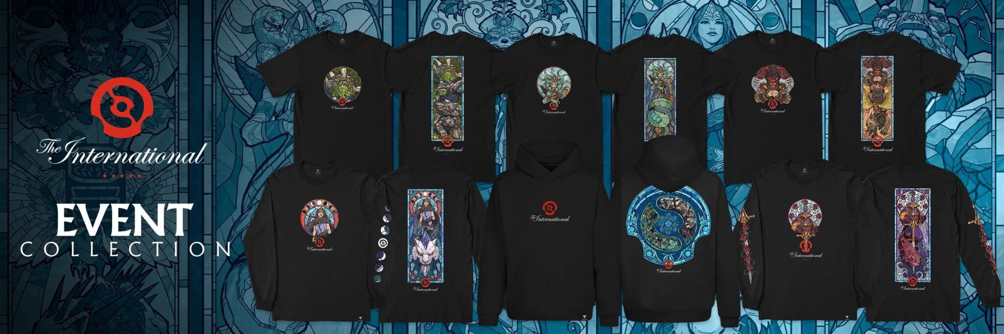Much of the main line of event merch sticks switch the safe but reliable Black T-shirt and hoodie with a cool design motif, using the stained glass that has become a core part of TI12’s design in many pieces.