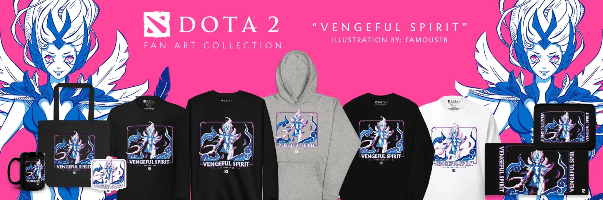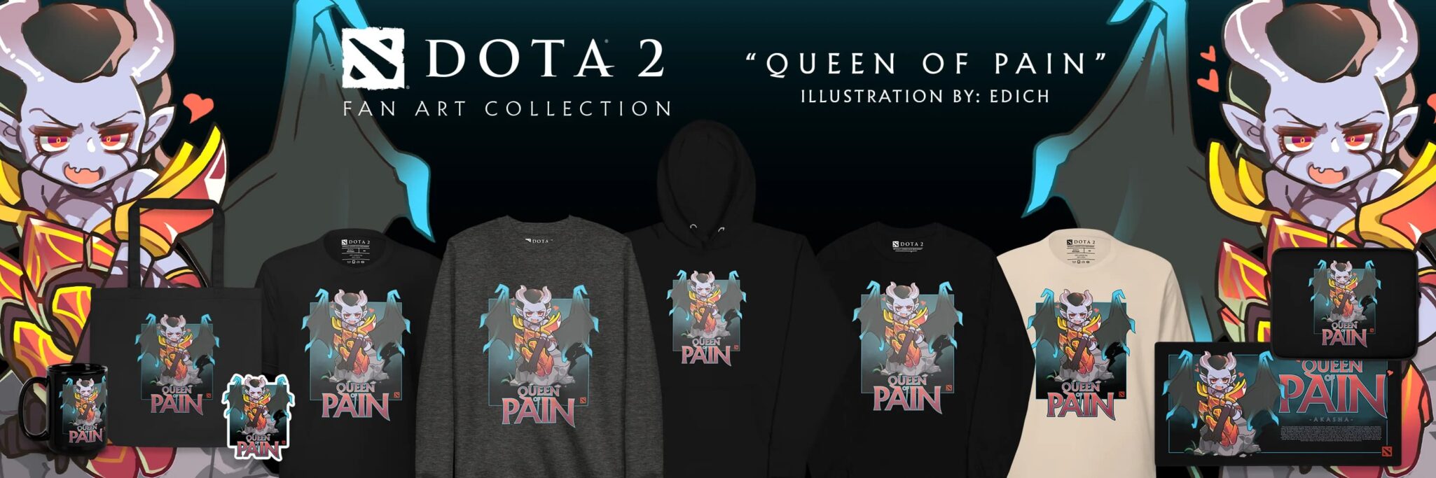 Always a treat, this year’s Fan Art collections feature seven incredibly cute designs based on six heroes. With art from FamouseF8, Edich and Botjira, there’s an adorable pastel Mirana set, a super serious crimson Legion Commander collection, another adorably moonlight-inspired Mirana collection, A pink Pudge one that’s adorable, a sinister Queen of Pain set, a set of advertisements of Tidehunter Ramen, and a super stylized Vengeful Spirit series.