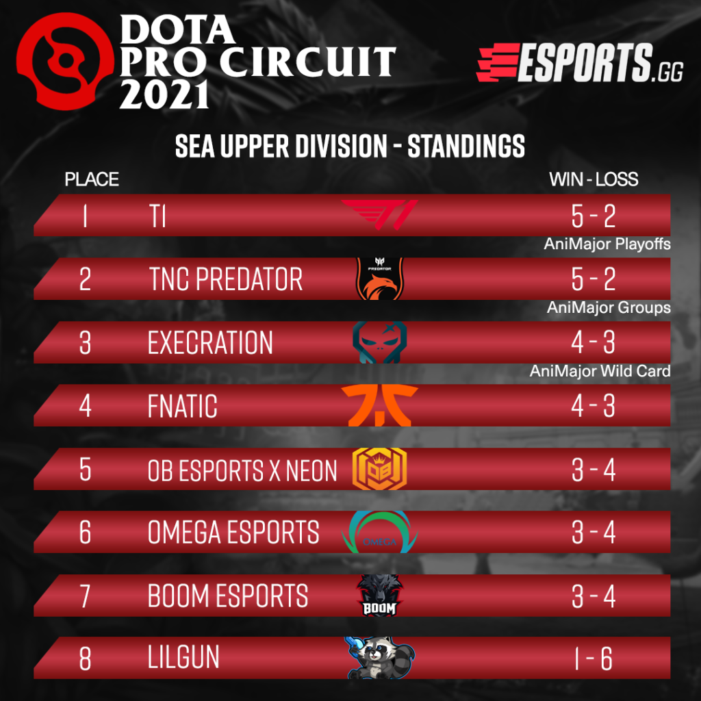 Southeast Asia may be considered the weakest Dota 2 region but NEON esports proved naysayers wrong a few weeks ago. This time around, NEON did not qualify for the Major. But the competitive nature of the season highlights how close some of these teams are when it comes to skill and strategy. T1 esports tops the list and has qualified for the Animajor playoffs. TNC Predator will start in the group stage while Execration, a relatively unknown team on the international stage will get a chance to prove itself against the best teams in the world
