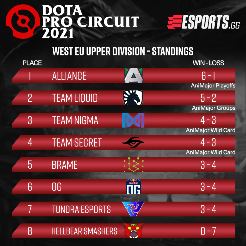 Alliance tops the list with six wins and one loss and will compete in the Animajor playoffs. Team Liquid will move to the group stage while Nigma and Secret will have to contend via the Wild Card stage. Each of these four teams is more than capable of winning the entire tournament.