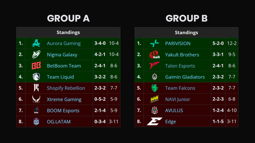 The eight teams that make it to the second group stage will face each other in a best-of-three (Bo3) format. The same point system applies, allowing the Top 2 teams to play from the upper brackets, and the bottom two will have to go through the lower brackets. Then, four teams are eliminated.