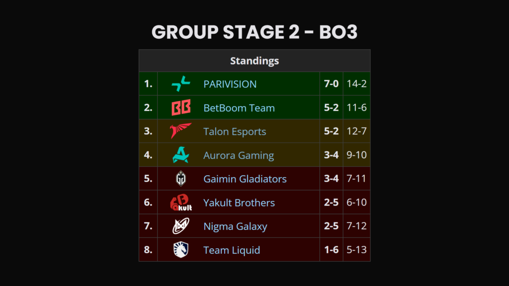 - Group Stage 2: First place — the same story, no defeats. The only teams that got them to a third game were Aurora and Talon.