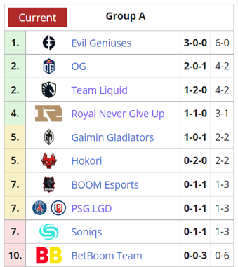 The day ends with EG at the top of Group A