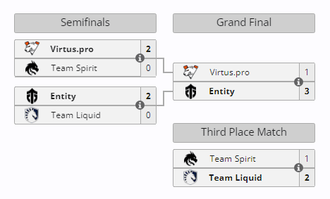 This marks Entity's first major victory in history. The team did secure a couple of first place finishes in tier 3 tournaments before, but this was a much more significant win. Entity gets to bring home a lion's share of the prize pool, taking $50,000 dollars.