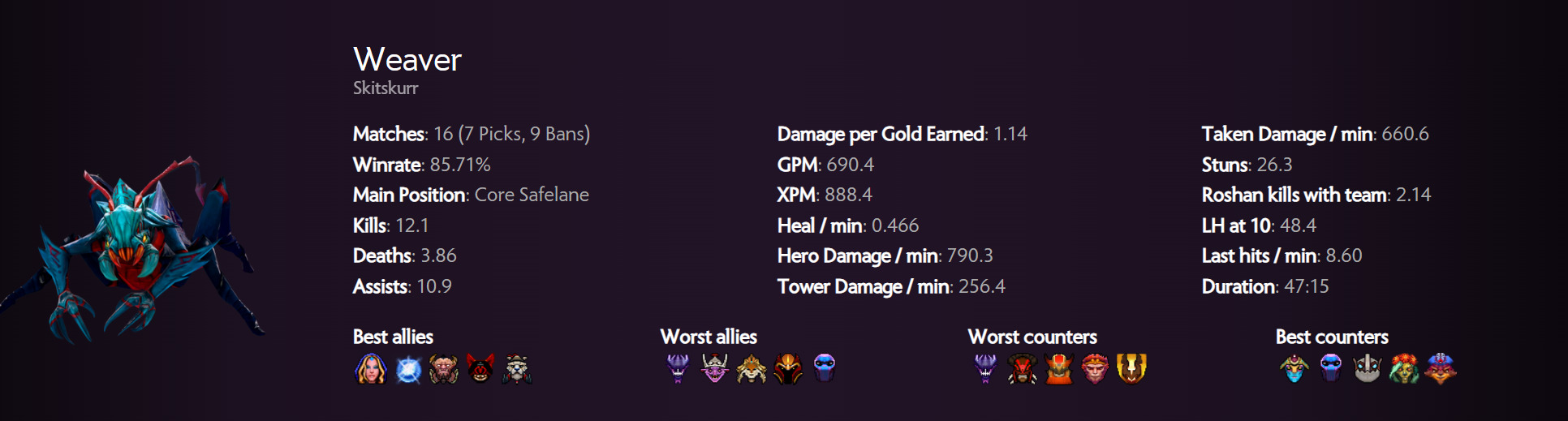 Like Enigma, Weaver sees a return at ESL One Birmingham 2024 as a carry hero, who also has the exact same 86% win rate. The last changes to Weaver made him a more viable carry than a support, the role where he excelled for a long time at one point. With increased damage to Germinate Attack and Shukuchi, Weaver is one of the heroes that deals the highest amount of damage. Unlike the first two heroes, Weaver is fairly easy to play. Unfortunately, the pubs have not been too kind as he only has a 49% win rate.
