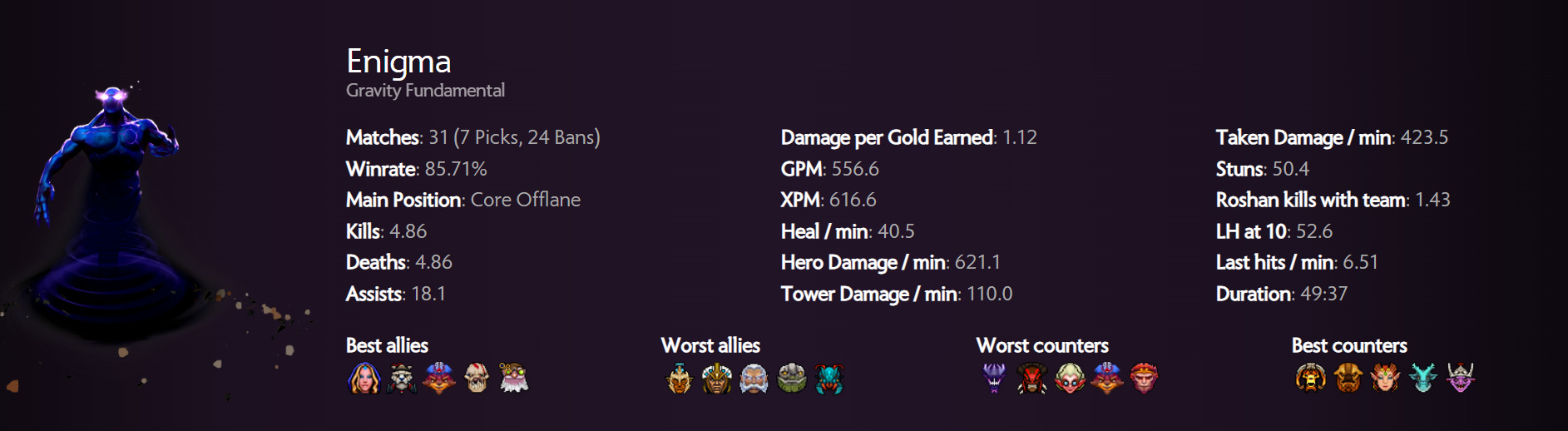 For the offlane meta, we go back to the classics with Enigma dominating ESL One Birmingham 2024. There are only seven Enigma games played so far, but that’s because Enigma has a decent ban rate amongst other heroes. Otherwise, he has a whopping 86% win rate, the highest in game thus far. Like Enchantress, Enigma has a higher skill threshold and is therefore a challenging hero to play in pubs. He fares slightly better than Enchantress in Immortal ranked pubs with a 53% win rate.