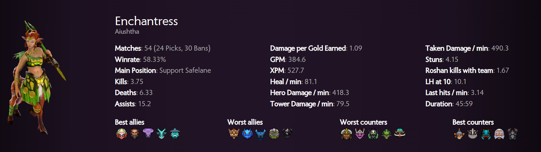 First on the list and for the support role, we have Enchantress. Predominantly more successful as a safelane support, Enchantress accrued a 58% win rate over the course of 24 games. She is the second most-picked hero at ESL One Birmingham so far right after Tiny. However, she is one of the more difficult heroes to play. So tread lightly when playing her in pubs, especially since she only has a 44% win rate outside of the tournament.