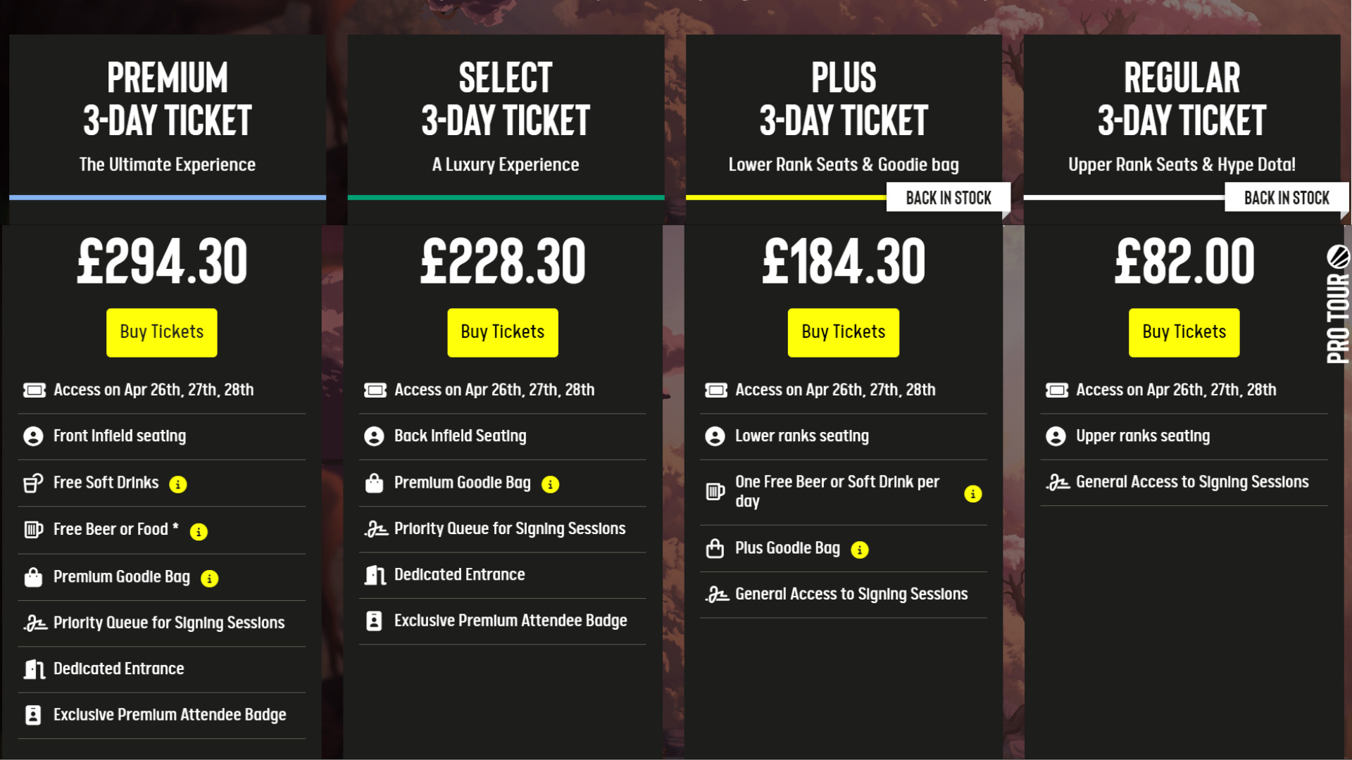 | Plus 3-Day Ticket | $230 | Lower ranks seating One Free Beer or Soft Drink per day Plus Goodie Bag General Access to Signing Sessions |