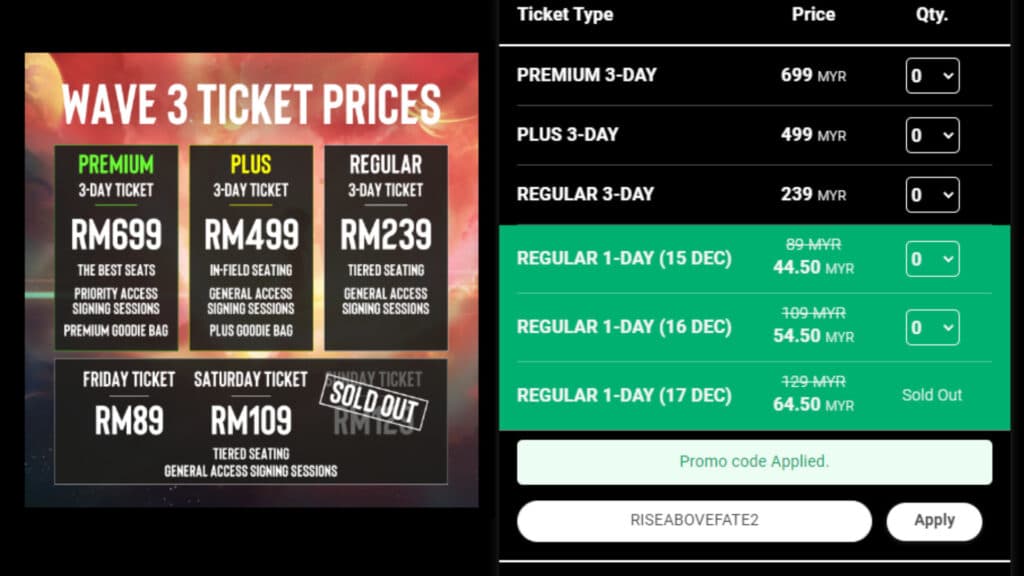You can use the ESL One Kuala Lumpur promo code "RISEABOVEFATE2" for a 50 percent discount on the Regular 1-Day ticket price. However, the discount is only applicable for the first two days of the main event on December 15 and 16. Unfortunately, the Regular 1-Day ticket for the final day of ESL One Kuala Lumpur has since been sold out. Therefore, you will need to buy the 3-day ticket in order to watch the grand finals. Below is a price list of the tickets that are still available: