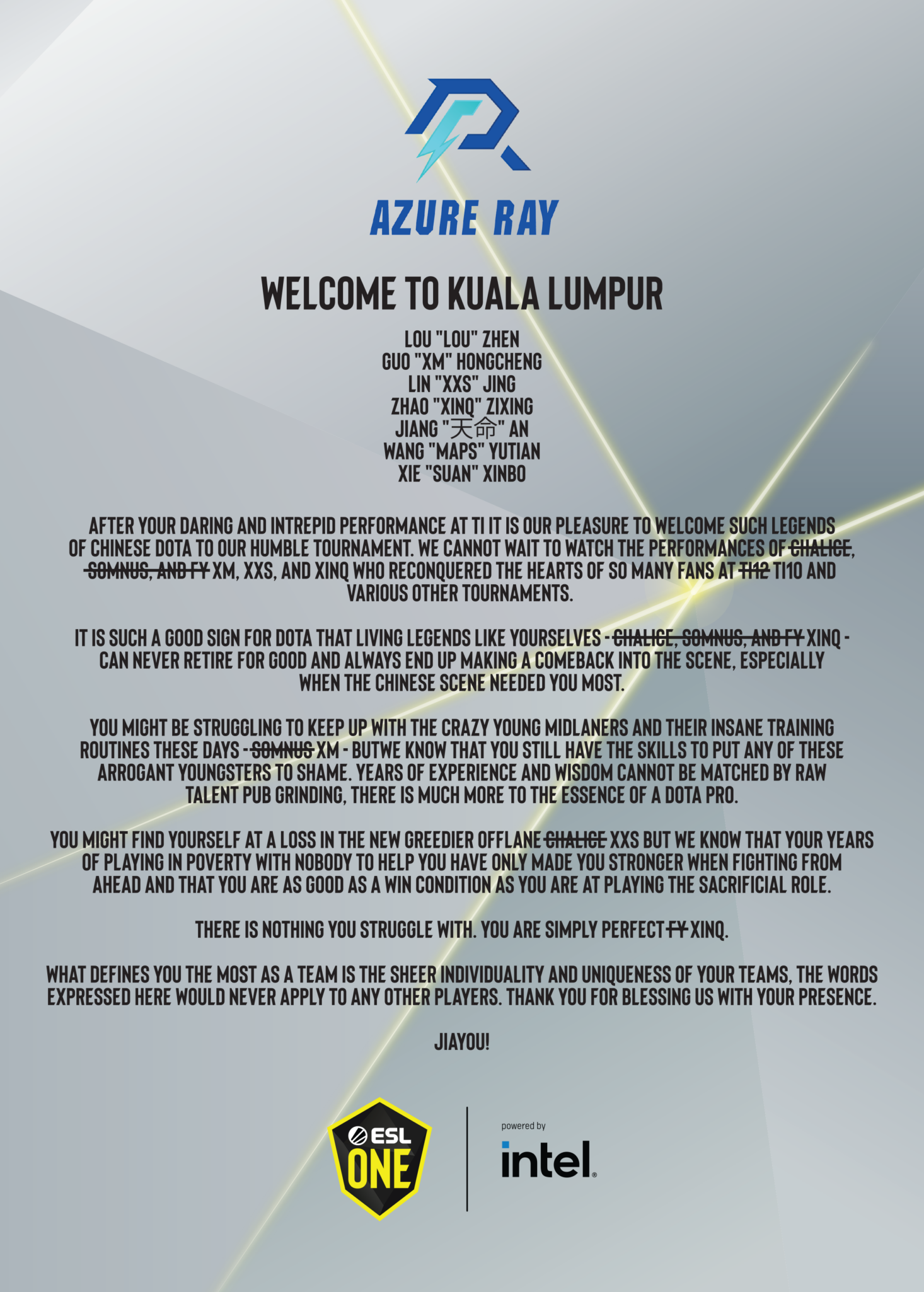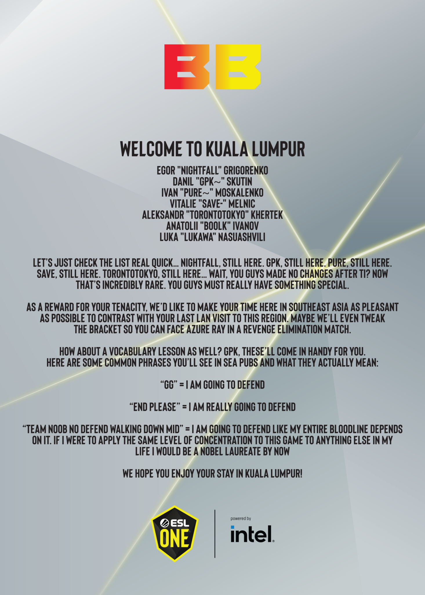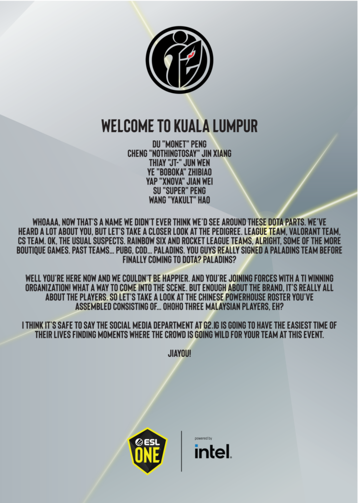 Fresh memes and inside jokes from the teams you love: We've compiled all the Welcome Letters from ESL ONE Kuala Lumpur!