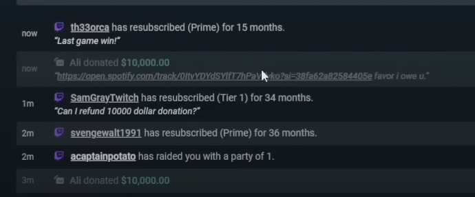 But Ali, who the chat suspects to be a Saudi Arabian prince, is not done yet. He would then donate another $10K but this time with a Spotify link and a short message -“favor i owe u”.