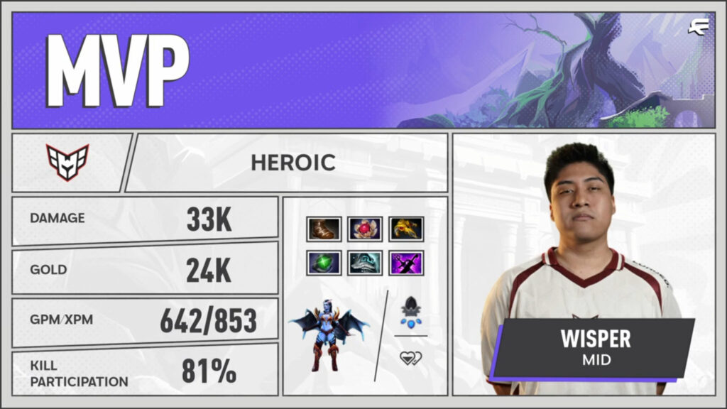 While the five players had an amazing performance, leading the game by 14K net worth and 28-7 kill score by thirty-two minutes, it was Wisper who got all the attention. His QoP performance was one of the best of the tournament, and it’s quickly becoming his new favorite hero for this new role. Even Sébastien “Ceb” Debs made a video about his particular QoP style, comparing him to the two-time TI winner prodigy, Topias “Topson” Taavitsainen.