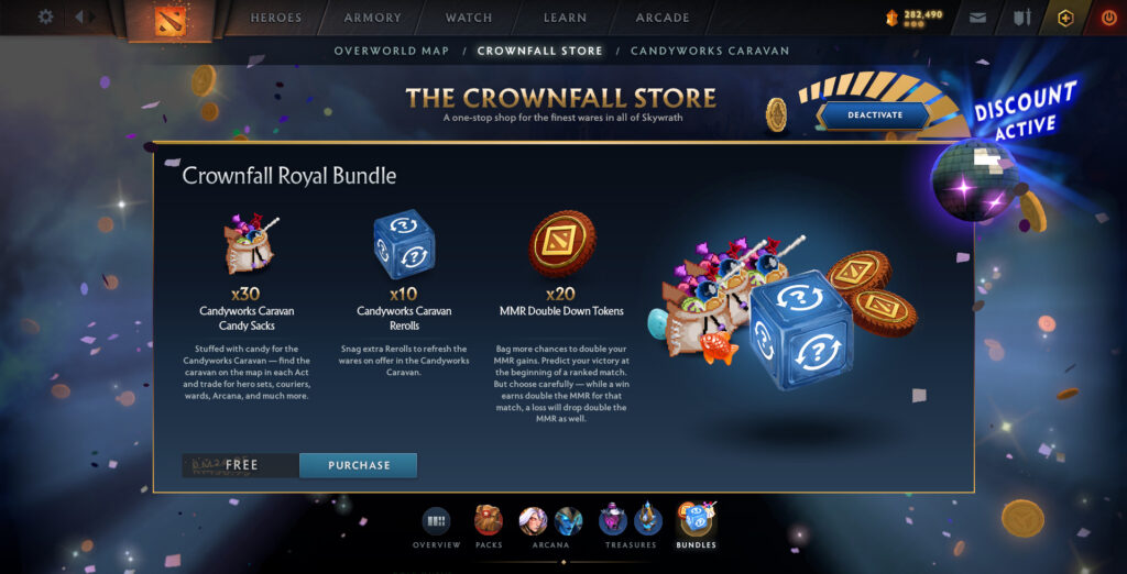 After activating the discount, you’ll be able to grab the Crownfall Royal Bundle for free! Inside this bundle, you’ll receive x20 MMR Double Down tokens, x10 Candyworks Caravan Rerolls, and x30 Candyworks Caravan Candy Sacks.