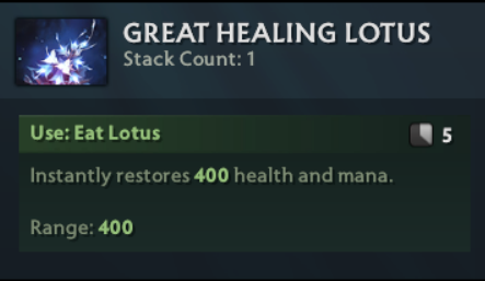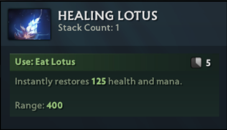 Every three minutes, each Lotus Pool spawns a Healing Lotus. The Healing Lotus grants 125 HP and 125 Mana when consumed. Collecting the Lotuses can be a great way to save money as you don’t need to purchase your own sustains such as Healing Salve and Mangoes.