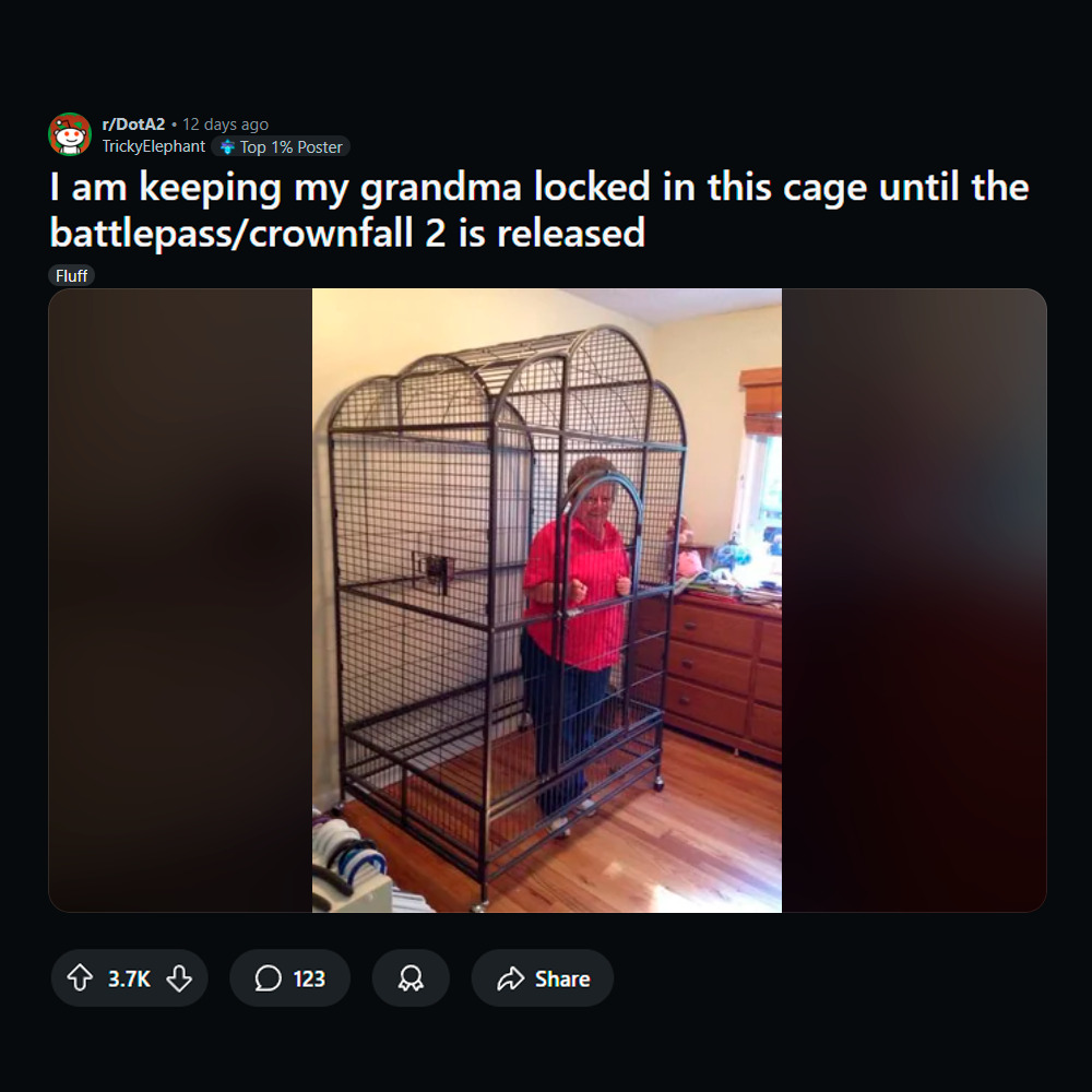 The Dota 2 subreddit is full of Battle Pass memes. Some of them are funnier than others. But we all know Valve sometimes bends under community pressure, which is why we must raise awareness about u/TrickyElephant’s grandmother, who remains trapped in a cage until Valve releases this year’s Compendium.