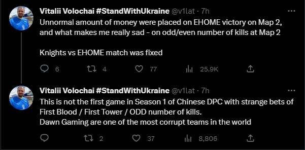 Ukrainian commentator, V1lat, who was a part of the commentator lineup of CN DPC, stated, “Unnormal amount of money were placed on EHOME victory on Map 2, and what makes me really sad – on odd/even number of kills at Map 2. Knights vs EHOME match was fixed.”