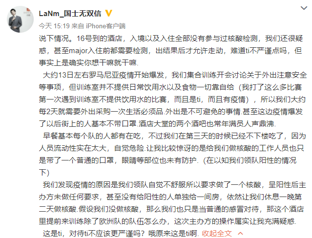 In LaNm’s long Weibo posts, he expressed his confusion on the TI protocols. There was no prior-testing, unlike the Majors where they had to do a COVID test before checking in, and were only allowed to leave the room after results show negative. He said that everyone is free to do anything, but shouldn’t TI be a lot more cautious?