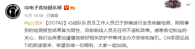 All members of IG that have taken COVID tests are reportedly negative. There is no frontline staff that feel abnormal. “We will be more cautious with protective measurements while waiting for the tournament organizer’s instructions. It is a tough road for the CN army, wish everything goes smoothly, cheers.”