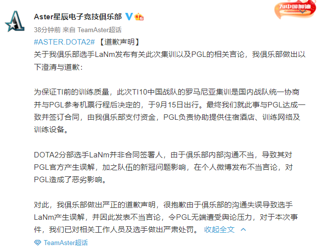 Today, Team Aster released a public apology regarding to LaNm’s statements earlier with detailed clarifications.
