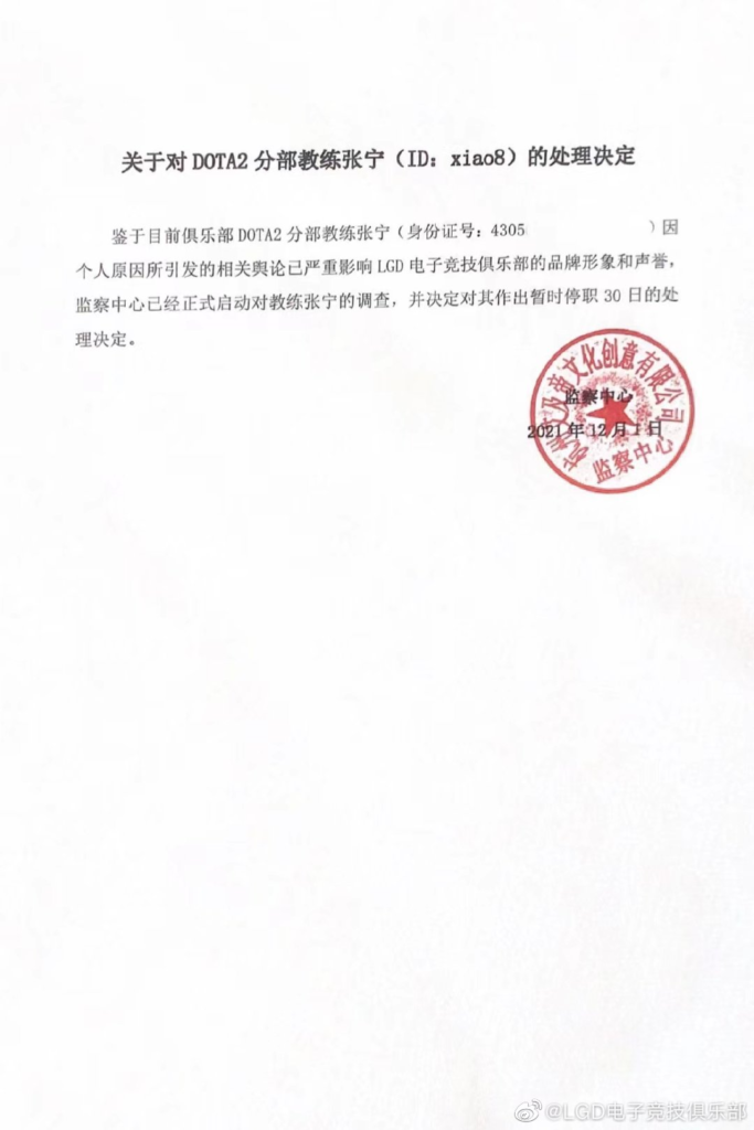 Regardless of the current truth of the allegations, LGD is taking the matter very seriously. They have released a statement and sent an email to Valve requesting audio finals from TI10 in order to investigate the matter thoroughly. In that same email, they revealed that xiao8 is being suspended for the time being, a period of 30 days.