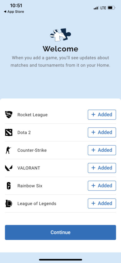 Once you have the app opened, it will have you click on which games you want to follow. This allows for a better integration catered to the user.